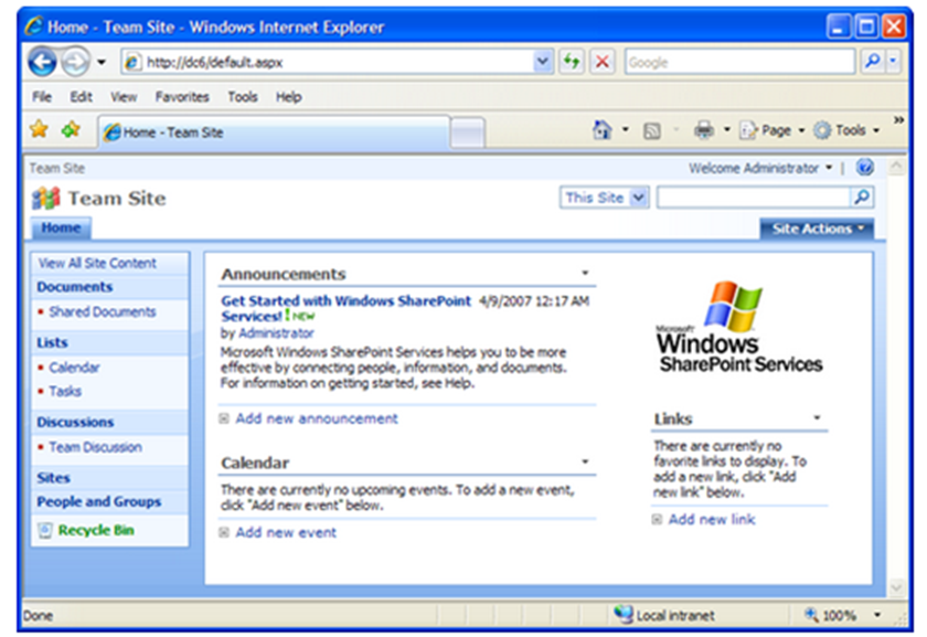 Windows SharePoint Services or Sharepoint provides the means to put together an intranet. You can install SharePoint through the ‘Add/Remove Programs’ in Windows Server 2003 R2 or you can download the latest version compatible with your server OS from Microsoft website.