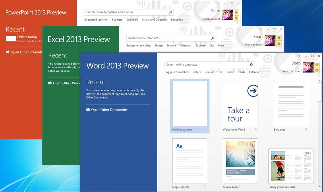 Aside from the Ribbon, the interface is similar but much simpler than it was in Office 2010 and earlier. Newly added start pages for Word, PowerPoint, and Excel help you get to recent documents attached to your account and new templates immediately upon launch. Flat buttons and plenty of white space make the interface look less crowded. Other interface tweaks are tablet-focused such as the radial menus in OneNote that show options (like sharing, search, and zoom tools) in a circle around the area you press. The general feel of the suite is more streamlined and more cloud-integrated, and the new start pages for the core apps will be especially useful for those looking at the same documents on several devices.